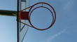 Medium low-angle slow-motion shot of a red netball falling down in a hoop. The camera is directly below the hoop, facing upward towards the ball. Blue skies can be seen above. The ball bounces off around the rim before falling through.