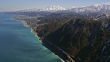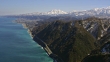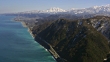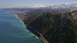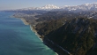 Bird's-eye shot of Itoigawa city in Niigata prefecture facing the Sea of Japan, and the snow-capped Myoko-Togakushi Renzan(Mountains) National Park. Shot by 4K UHD helicopter camera.