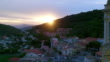 Aerial forward shot of church in town on mountains during sunset - Church in town on mountains
