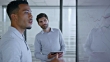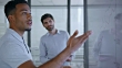 Medium handheld shot of an African-American man explaining a graph shown on the screen in the meeting room to his Caucasian male colleague. Shot in Slovenia.