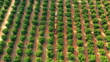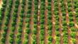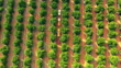 Agriculture agricole, agriculteurs et camion pour l’industrie de la production alimentaire avec drone sur le verger d’orangers. travail d’équipe, train tracteur et transport pour le développement et la distribution des agrumes - Vidéo 4K