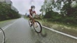 Asian chinese sportsperson cycling over taking teammate leading in raining day