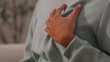 On her couch, an Asian woman shows visible signs of discomfort and pain, hinting at early symptoms of a heart condition.