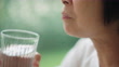 Asian mature woman drinking water at sofa.