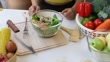 Belle femme asiatique en bonne santé mangeant joyeusement une délicieuse salade de légumes à la maison. Belle fille sportive en tenue de sport aime manger des légumes propres après l’exercice pour la santé à la maison. Régime alimentaire et alim - Vidéo 4K