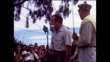 Bob Hope walking out of the crowd to speak in front of the microphone; Del Webb and men in golfing uniform and ivy caps and golfing clubs joins him, they pose for photo in front of an American flag surrounded by the crowd