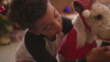 CU TD HANDHELD Boy (6-7) embracing Bedlington Terrier wearing Christmas clothing / Dinton, Wiltshire, UK