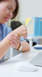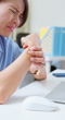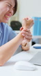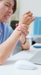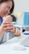 pain at work - vertical side view closeup asian businesswoman with discomfort from mouse hand has carpal tunnel syndrome