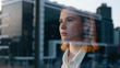 Businesswoman, thinking and window in city by buildings, ambition and career planning in new apartment. Young person, achievement or idea in corporate job or management with suit in urban cityscape