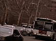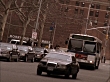 NEW YORK CITY: HARLEM: WS City bus w/ Morningside Garage BG, Broadway at 123rd Street, M104 West Harlem bus moving on street, passing through frame REVEALS street signs on pole Moylan Place & Broadway (bent back sign, way not showing).