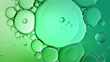 Close up and slow motion of overhead view of pouring clear menthol colored oil into a pool of water and filling up the frame with floating oil drops against a back lit green gradation background - Vidéo 4K