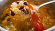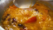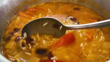 Une vidéo en gros plan d’une cuillère prélève une portion de riz dans un pot de haricots, de légumes et d’un bouillon doré. - Vidéo 4K