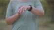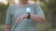 In the evening at a public park, a 44-year-old Asian woman, focused on getting fit, sets her smartwatch program and displays an infographics hologram before starting her exercise routine.