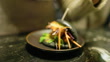 Gros plan sur un pain bao noir garni de légumes croquants et de lanières de carottes dorées - Vidéo 4K