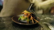 Close-up of a black bao bun on a dark ceramic plate, filled with shredded carrots, leafy greens, and crispy golden fried chicken.Shot with Canon R5
