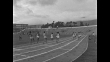 Crowd in stands at Olympic Stadium for the Bolivarian Games, pan across to track / official fires starting gun / runners exchange batons in men's 400-meter relay / shots of three more baton exchanges / crowd watches / contestants run towards camera, Peruvian team winning / crowd stands and applauds / people congratulate Peruvian runner / Note: exact day not known