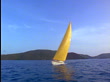 Dolly shot PAN sailboat with yellow sail sailing past camera / Virgin Gorda, Virgin Islands - Vidéo