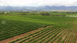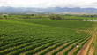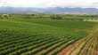 Drone shot of two tractors making their way through the rows of vineyards spraying chemicals. Farmers spray the vineyards early summer in the Breede River Valley near Cape Town.
