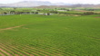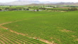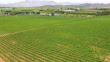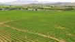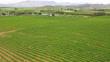 Drone shot of two tractors making their way through the rows of vineyards spraying chemicals. Farmers spray the vineyards early summer in the Breede River Valley near Cape Town.
