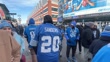 DETROIT, MICHIGAN - JANUARY 21: (EDITORS NOTE: audio/music licensing is not included.) Fans gather outside the stadium ahead of the NFC Divisional Playoff game between the Tampa Bay Buccaneers and the Detroit Lions at Ford Field on January 21, 2024 in Detroit, Michigan. (Footage by Gregory Shamus/Getty Images)