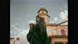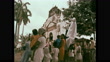 1970s: Men carry statue of Mary through crowd in Easter parade. Men play instruments in marching band. Men carry statue of Jesus Christ through parade. Women in colorful dresses dance
