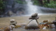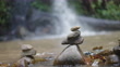 This video shows the action of a hand stacking rocks on a protruding boulder from a creek near a waterfall.