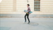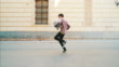 Carefree young man holding his skateboard and dancing on the streets. Tracking shoot scene.