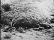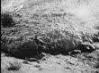 B/W high angle molten lava knocking down + burying running cavewoman - Vidéo