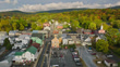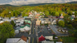 Aerial establishing shot of the town of Boonsboro, Maryland, taken by a drone flying forward on a Fall afternoon.