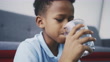 Close-up shot of teenage boy drinking water in living room
