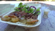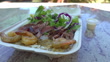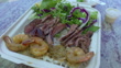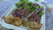 A platter sampler of Local Hawaiian food in the south area of the Big Island in Hawaii, we see some beef, some shrimp, jasmine rice, and lettuce, all in a takeaway platter.