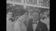 Title card: "New York - Historic Film Has Premiere - Hollywood" superimposed over pan of Times Square / WS Times Square at night / CU ground level shot of crowds and cars outside Capitol Theatre at premiere of "War and Peace" / MS marquee: "War and Peace" / CU marquee: War and Peace / MS rear shot of people entering theatre / CU actor Oscar Homolka arrives, waving / MS cameramen / CU Homolka escorting two women into theatre / CU actress Anne Baxter out of car, waves / MS cameramen / CU Barney Balaban, President and director of Paramount Pictures, and his wife Tillie arriving / CU Edward G. Robinson, actor, arriving and waving / PAN from cameramen to Italian film actress Sylvana Mangano and her husband Dino DeLaurentiis, film producer from Italy, both walk into theatre / CU Mangano and DeLaurentiis posing, in answer to question, DeLaurentiis SOT in broken English that he is too excited emotionally to give his opinion in English or Italian; he turns to Mangano and after an exchange of indistinguishable remarks SOT she indicates in English that she feels likewise / WS crowd in front of theatre / WS Times Square at night // Hollywood, California: EXT of premiere in Hollywood / VS people entering theatre, cutaway CU searchlight / CU producer King Vidor and his wife Elizabeth / MS front of theatre / CU photographers / CU DeLaurentiis and Mangano / MS people entering theatre / MS crowd / CU screen and TV comedian Jerry Lewis and wife Patti / MS policeman holding back crowd / CU Lewis and wife, Lewis mugging / MS car pulls up in front of theater / CU crowd / MS actor Tony Curtis and his wife actress Janet Leigh signing autographs / CU crowd / MS actress Claudette Colbert posing / rear shot Colbert walking toward crowd in front of theatre / photographers / VS EXT theatre