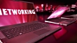 Ordinateurs portables affichant technologique mots sur un arrière-plan de la ville - Vidéo HD