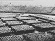 Pan German troops in formation at Nazi Party rally grounds (Luitpoldarena) in Nuremberg, with stands packed / side view German chancellor Adolf Hitler speaks / montage young boy, young men listen / from Greatest Headlines of the Century series / Note: [exact date not known]