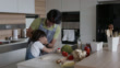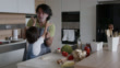 Papa et fils espiègles faisant la pizza et barbouillant la farine sur leurs visages riant et souriant à la maison - Vidéo 4K