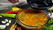 Preparing vegan minestrone with green beans and fresh herbs. Serving a portion of the soup. Close-up view