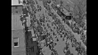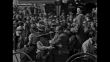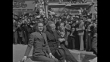 Quick WS cast of Dodge City movie dressed in cowboy hats and boots on railroad platform smiling and waving / WS looking down on parade of movie cast, crowds on both sides of street / WS governors of three states--Kansas, Colorado, and New Mexico--ride in convertible, wave, smile / Allan Hale Sr. waves his hat / horse-drawn wagon in parade with Olivia de Havilland, Ann Sheridan, Bruce Cabot and others waving, smiling / WS crowd in stands clapping. SOME SOUND in this clip.