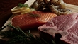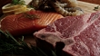 Raw T-Bone Beef Steak, Shrimp, and Salmon Gourmet Food
