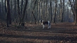 Handheld shot of a large Russian wolfhound dog walking slowly on footpath in a misty forest. Camera @ 12mm, f/5, 1/100