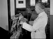 MOT 1942: DURHAM, NORTH CAROLINA: LIGGET-MEYERS TOBACCO COMPANY: CU 'Smyrna' sign on tobacco cart. MS Male holding tobacco leaves, throwing into screen cube for reconditioning. CU Male hands mixing through falling tobacco. Tobacco up conveyor belt.