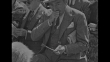 Title card: "'Stagehand' wins $60,275 Derby" / Title: 'Arcadia, Calif" superimposed over view of racetrack's paddock area / pan of huge parking lot filled with cars / covered stands with racetrack right / betters at windows / high angle of people at windows / more people at windows / Pat O'Brien laughs with Joe E Brown / Carole Lombard with Clark Gable / George Raft with betting sheet / Adolphe Menjou / Bing Crosby with pipe / Barbara Stanwyick / rear view of horses headed to the track / (scratch, middle of screen) long pan of horses out of the gate and running in front of stands / horses running backstretch / pan right final turn and horses run on the straightaway / aerial shot of Stagehand winning / # 6 Stagehand in winner's circle / [Note: vertical line printed on film, complete repeat of video follows without audio and clean print with no line]
