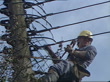 Storm damage / many areas still without electricity; ENGLAND: Kent:EXTMS Man standing on roof damaged in storm PULL OUT country roadMS Man sawing at branch of fallen tree as another drags branch towards of roadMS SIDE man strapped to side of pole mending broken electricity linesINTTMS Hand puts saucepan on baked beans on open fireCMS SIDE Little boy eating plate of baked beansCMS DAWN GLASS (Housewife) INTVW SOF(How we are managing with no electricity) "It's a shockCUTAWAYSTMS Car batteryMS Spot light attached to wall-- couple of candles"