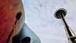 The EMP museum in Seattle with the space needle, blue sky and clouds passing by.