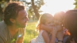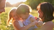 Happy family on the nature of the summer, mother, father and children two sisters hugging.Sunset