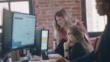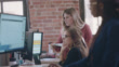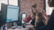 Trendy coworker uses stylus pen on touchscreen computer monitor while standing next to her sitting colleague - Vidéo 4K