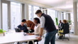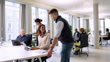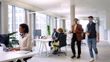 Two business people walking into office, arrive at desk and assisting colleagues at startup. Multiracial business people working at open plan office space.