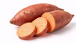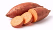 Whole and Sliced Orange Sweet Potatoes with Smooth Skin on White Background