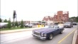 WIDE ANGLE OF SMALL TOWN AREA OF BRANSON, MISSOURI. CARS, SUV'S, AMPHIBIOUS TOURIST BOAT DRIVING SLOWLY OVER RAILROAD CROSSING AND THROUGH LOCAL STREETS. CROSSING SIGNALS, HILTON HOTEL, EMERGENCY VEHICLE, AND PARKING LOT VISIBLE. TOURISTS IN BOAT WAVE TO CAMERA AS THEY PASS BY. CLIFFSIDE HOUSES VISIBLE IN BG.
