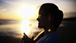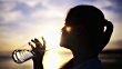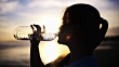 Woman drinking water at the beach in last sunlight.