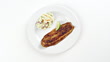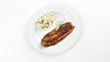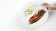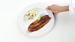 CU Woman hand entering setting down round white plate with blackened halibut fish and cole slaw / Omaha, Nebraska, United States - Vidéo HD